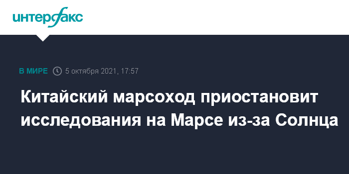 Москва. 5 октября. INTERFAX.RU - Китайский марсоход "Чжужун" и зонд "Тяньвэнь-1" приостанавливают свою работу из-за солнечной интерференции. Об этом сообщает во вторник Центральное телевидение Китая (CCTV) со ссылкой на Китайское национальное космическое управление (CNSA).