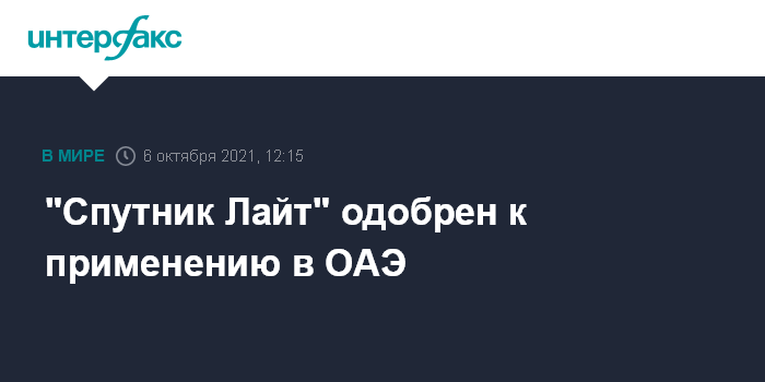 "ОАЭ одобрили однокомпонентный "Спутник Лайт", первый компонент "Спутника V", как отдельную вакцину", - сообщается в твиттере производителя вакцины.