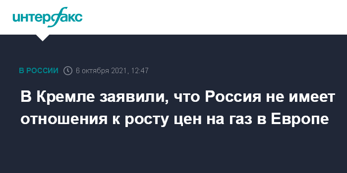 Москва. 6 октября. INTERFAX.RU - Россия не имеет никакого отношения к росту цен на газ в Европе, заявил пресс-секретарь президента РФ Дмитрий Песков.