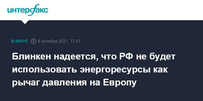 Москва. 6 октября. INTERFAX.RU - Госсекретарь США Энтони Блинкен выразил надежду, что Россия не будет использовать поставки ее энергоресурсов как рычаг для давления на страны Европы.