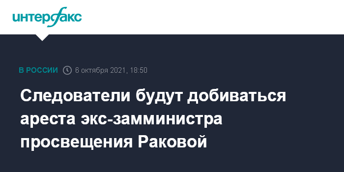 Москва. 6 октября. INTERFAX.RU - Следователи полиции намерены добиваться ареста бывшей вице-президента Сбербанка, экс-замминистра просвещения России Марины Раковой по делу о крупном мошенничестве, сообщил "Интерфаксу" информированный источник.