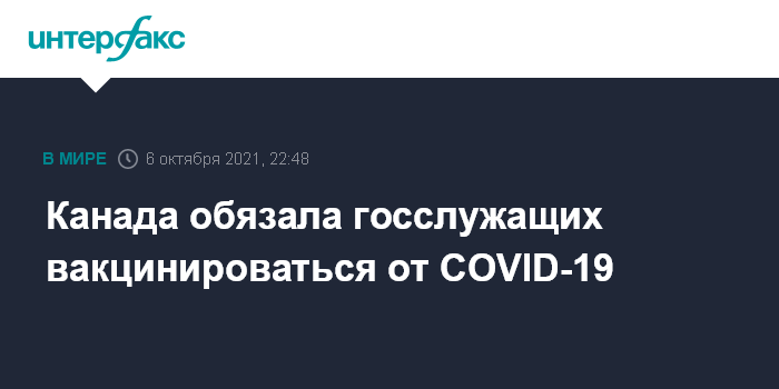По данным СМИ, канадских государственных служащих - около 300 тыс. человек - обязуют вакцинироваться до конца октября, хотя допускается ряд медицинских исключений. Всех прочих служащих, кто не пройдет курс вакцинации до истечения октября, отправят в отпуск без сохранения жалования. В свою очередь лица от 12 лет, кто путешествует по Канаде по железным дорогам или воздушным транспортом, должны вакцинироваться до конца ноября.