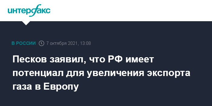 Москва. 7 октября. INTERFAX.RU - Россия имеет возможность увеличить экспорт газа в Европу, все зависит от соответствующих запросов, действующих контрактных обязательств и коммерческих договоренностей, заявил пресс-секретарь президента РФ Дмитрий Песков.