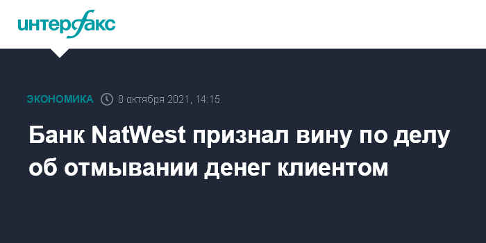 Москва. 8 октября. INTERFAX.RU - Подразделение британского банка NatWest Group PLC (бывший Royal Bank of Scotland) признало себя виновным в нарушении норм регулирования, обязывающих финансовые институты придерживаться надлежащих систем борьбы с отмыванием денег. Об этом говорится в пресс-релизе кредитной организации.