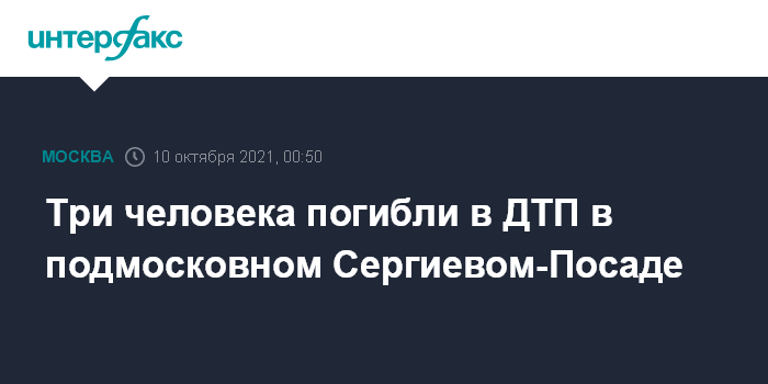 "Около 22:30 сегодня (9 октября - ИФ) на 7 километре автодороги "Сергиев Посад -Рыбинск - Череповец - Константиново" в Сергиево-Посадском городском округе произошло встречное столкновение двух легковых автомобилей "Рено" и "ВАЗ". В результате ДТП (дорожно-транспортного происшествия - ИФ) водитель и двое пассажиров отечественного автомобиля погибли, ещё два пассажира получили травмы, также ранен водитель иномарки", - сказали в пресс-службе управления.