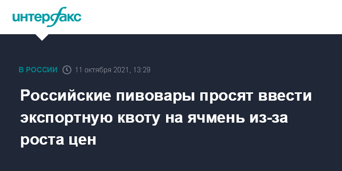 Москва. 11 октября. INTERFAX.RU - Союз российских производителей пивобезалкогольной продукции (Союз российских пивоваров) просит ввести экспортные квоты на ячмень и солод и одновременно существенно повысить экспортные пошлины.