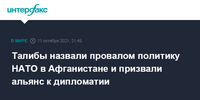 Москва. 11 октября. INTERFAX.RU - Радикальное движение "Талибан" (запрещено в РФ) считает провалом афганскую политику НАТО и призывает альянс теперь сфокусироваться на дипломатии, сообщает портал Ariana News со ссылкой на заявление заместителя министра информации и культуры талибов Забихуллу Муджахида.