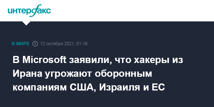 Москва. 12 октября. INTERFAX.RU - В Microsoft заявили, что связанные с Ираном хакеры с июля угрожают оборонным компаниям из США, Евросоюза и Израиля. Об этом корпорация написала на своем сайте.