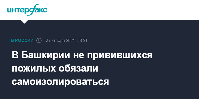 Москва. 12 октября. INTERFAX.RU - Глава Башкирии Радий Хабиров сообщил, что по просьбам главврачей вводит в республике с 13 октября режим обязательной самоизоляции для людей возрастом 65 лет и старше, которые не привились от коронавируса.