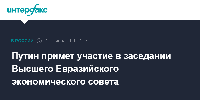 Москва. 12 октября. INTERFAX.RU - Президент Российской Федерации Владимир Путин 14 октября примет участие в заседании Высшего Евразийского экономического совета, которое пройдет в формате видеоконференции, сообщила пресс-служба Кремля.