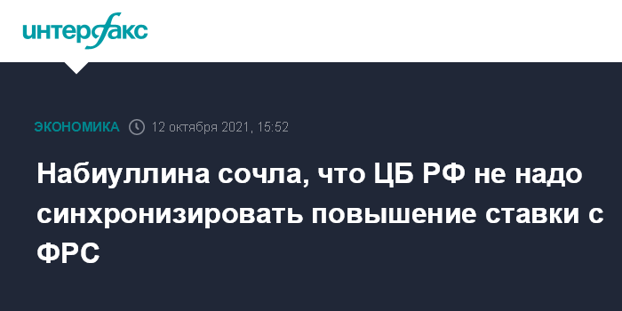 "Я не придерживаюсь аргумента, что нам надо оставить пространство для повышения ставки, чтобы это делать вместе с ФРС", - сказала Набиуллина, выступая на онлайн-мероприятии по теме "Динамика инфляции и денежно-кредитные меры реагирования" в рамках осенних встреч МВФ.