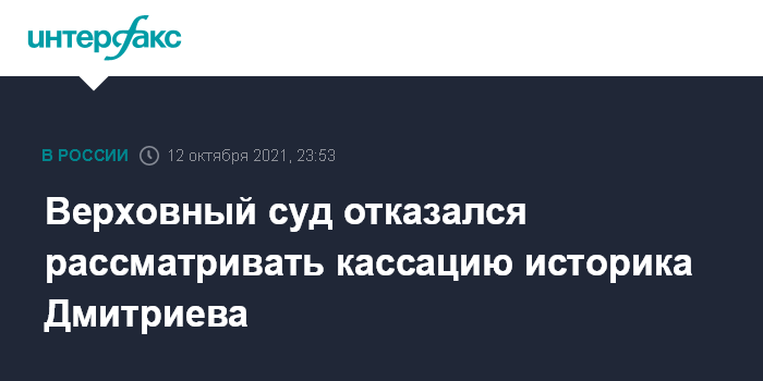Москва. 12 октября. INTERFAX.RU - Верховный суд РФ не будет рассматривать кассационную жалобу по уголовному делу историка Юрия Дмитриева, осужденного и приговоренного к 13 годам колонии строгого режима по статье о насильственных действиях сексуального характера в отношении несовершеннолетней приемной дочери.