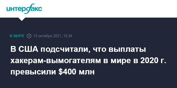 Москва. 13 октября. INTERFAX.RU - Жертвы кибератак, проводившихся при помощи вирусов-вымогателей, заплатили хакерам по всему миру около $400 млн в 2020 году, подсчитали в США.