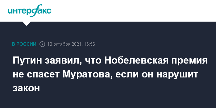 Москва. 13 октября. INTERFAX.RU - Главному редактору "Новой газеты" Дмитрию Муратову, удостоенному Нобелевской премии мира, не грозит признание иноагентом, если он будет соблюдать соответствующее законодательство, но если журналист его нарушит, то никакие заслуги не спасут его от ответственности, заявил президент РФ Владимир Путин.