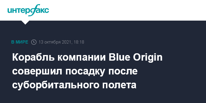 Москва. 13 октября. INTERFAX.RU - Многоразовый американский корабль New Shepard, стартовавший в среду в суборбитальный коммерческий полет с экипажем в составе четырех космических туристов, совершил успешную посадку, сообщила компания-разработчик Blue Origin.