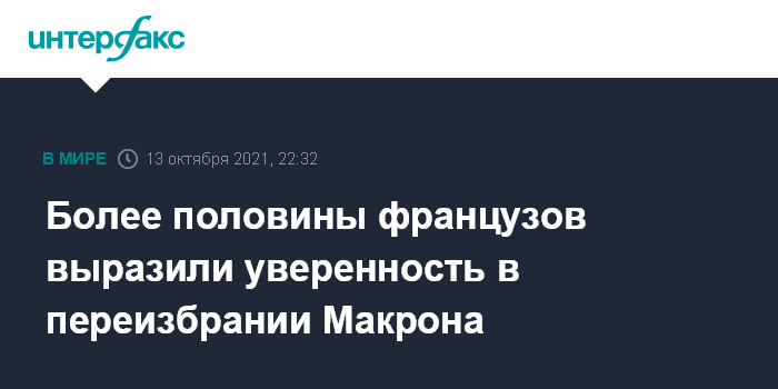 Москва. 13 октября. INTERFAX.RU - Чуть больше половины французских граждан считают, что нынешний глава государства Эммануэль Макрон будет переизбран в 2022 году, свидетельствуют данные опроса, проведенного институтом Elabe для телеканала BFM TV.