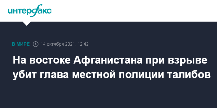 Москва. 14 октября. INTERFAX.RU - В результате взрыва убит назначенный движением "Талибан" (запрещенная в России террористическая организация) начальник полиции уезда Шигал провинции Кунар, сообщает Aamaj News.