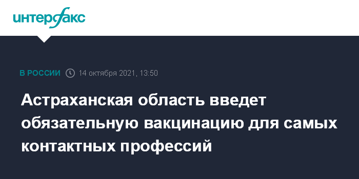 Москва. 14 октября. INTERFAX.RU - В Астраханской области на фоне роста заболеваемости COVID-19 и активной циркуляции штамма "дельта" решили ввести обязательную вакцинацию для профессий, у которых наибольшее число социальных контактов, объявила главный санитарный врач области Людмила Носкова.