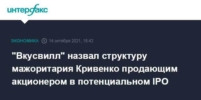 Москва. 14 октября. INTERFAX.RU - Основатель и основной владелец ПАО "Вкусвилл" Андрей Кривенко может продать до 20 млн акций ритейлера (10% от существующего капитала) в ходе возможного IPO, следует из проспекта компании.