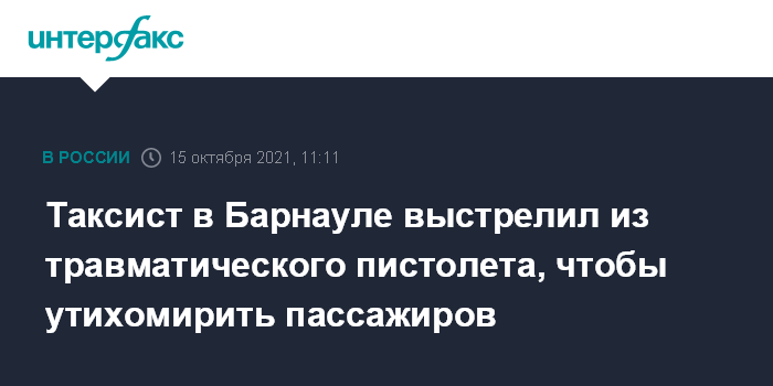 Москва. 15 октября. INTERFAX.RU - Сотрудники полиции в Барнауле разбираются в обстоятельствах конфликта между таксистом и двумя пассажирами, в ходе которого водитель выстрелил в воздух из травматического пистолета. Об этом сообщает пресс-служба Главного управления МВД РФ по Алтайскому краю.