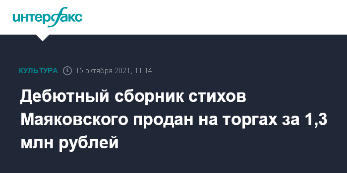 Москва. 15 октября. INTERFAX.RU - Первый сборник стихов Владимира Маяковского "Я", изданный в 1913 году, продан на аукционе "Литфонда" за 1,3 млн рублей, сообщили в пресс-службе аукционного дома в пятницу.