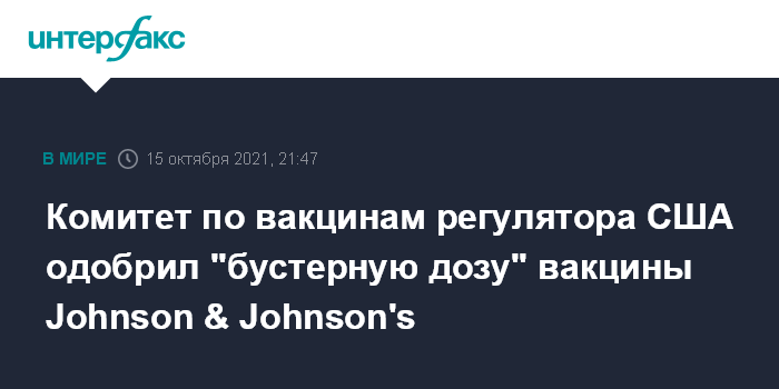 Москва. 15 октября. INTERFAX.RU - Комитет по вакцинам в американском Управлении по контролю качества пищевых продуктов и лекарственных препаратов (FDA) одобрил применение дополнительной дозы вакцины компании Johnson & Johnson's против COVID-19, сообщает CNN. Члены комитета поддержали это решение единогласно.