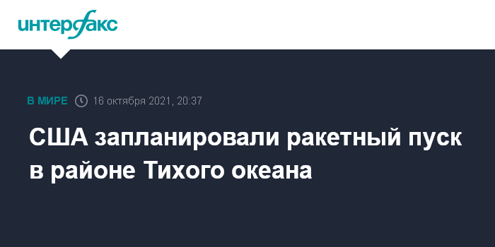 Москва. 16 октября. INTERFAX.RU - США планируют провести в период с 20 по 29 октября в районе Тихого океана запуск неизвестной ракетной системы, следует из навигационного предупреждения для пилотов и мореплавателей.