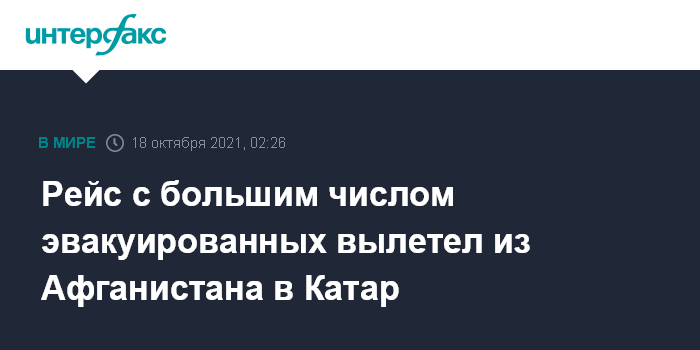 Москва. 18 октября. INTERFAX.RU - Один из крупнейших эвакуационных рейсов вылетел из Кабула в воскресенье, сообщает CNN со ссылкой на высокопоставленного чиновника правительства Катара.