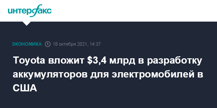 Москва. 18 октября. INTERFAX.RU - Японский автопроизводитель Toyota Motor Corp. сообщила, что инвестирует $3,4 млрд до конца 2030 года в разработку и локализацию производства электромобильных аккумуляторов в США.