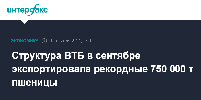 Структура ВТБ в сентябре экспортировала рекордные 750 000 т пшеницы