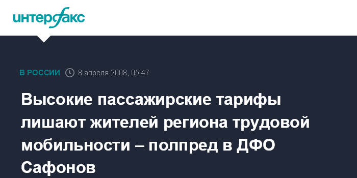 "Снижение тарифов на пассажирские и грузовые перевозки - ключевая задача в улучшении жизни дальневосточников. Высокие транспортные тарифы являются одним из угрозообразующих факторов экономической безопасности Востока России. Тарифы на грузовые и пассажирские перевозки в ДФО в 2,2 раза выше среднероссийских", - сообщил журналистам О.Сафонов по итогам встречи с президентом ОАО "РЖД".