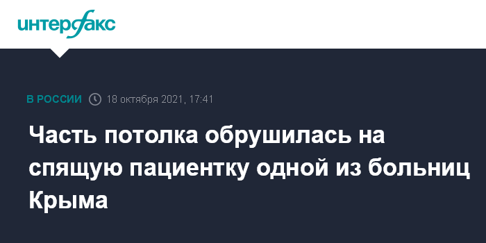 Москва. 18 октября. INTERFAX.RU - Пациентка клинического кожно-венерологического диспансера в Симферополе получила травмы при падении на нее фрагмента потолка. Об этом сообщили "Интерфаксу" в пресс-службе министерства здравоохранения Крыма в понедельник.
