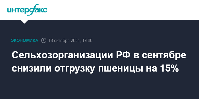 Москва. 18 октября. INTERFAX.RU - Сельхозорганизации РФ в сентябре этого года по сравнению с аналогичным месяцем прошлого года снизили отгрузку пшеницы на 15%, до 6,688 млн тонн, сообщается в материалах Росстата.