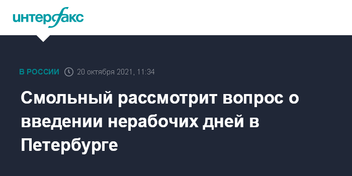 Москва. 20 октября. INTERFAX.RU - Администрация Петербурга рассмотрит вопрос о введении нерабочих дней в связи с ростом заболеваемости COVID-19, решение будет принимать губернатор Александр Беглов, сказал журналистам его заместитель Олег Эргашев.