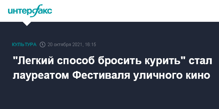 Москва. 20 октября. INTERFAX.RU - Победителем Фестиваля уличного кино стал фильм Алексея Кузмина-Тарасова и Анны Колчиной "Легкий способ бросить курить", сообщили организаторы смотра.