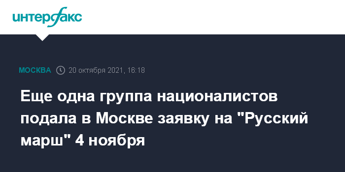 Ранее другая группа националистов - представители московского филиала международной ассоциации "Институт национальной политики" и организации "Русская правозащитная лига" - также направила в мэрию Москвы уведомление о проведении "Русского марша" 4 ноября. Согласно сообщению, марш планируется в Люблино по улице Перерва. Акция проводится там с 2009 года.