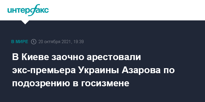 Москва. 20 октября. INTERFAX.RU - Печерский районный суд Киева в среду заочно избрал меру пресечения в виде содержания под стражей бывшему премьер-министру Украины Николаю Азарову, подозреваемому в совершении государственной измены по предварительному сговору группой лиц. Об этом сообщается на сайте Государственного бюро расследований (ГБР).
