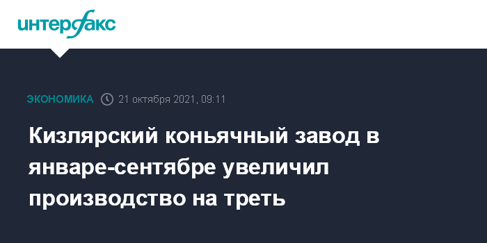 Москва. 21 октября. INTERFAX.RU - В первые девять месяцев 2021 года АО "Кизлярский коньячный завод" (ККЗ, Дагестан) увеличило производство на 34% в годовом измерении, до 390 тысяч дал, сообщил "Интерфаксу" гендиректор завода Евгений Дружинин. По его словам, объем реализации вырос на 27%, до 399 тысяч дал.