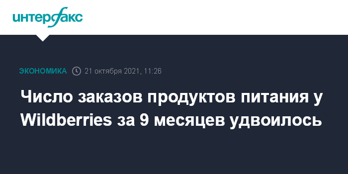 Москва. 21 октября. INTERFAX.RU - Количество в России онлайн-заказов продуктов питания, оформленных через Wildberries, в январе-сентябре 2021 года выросло почти в 2,8 раза по сравнению с аналогичным периодом прошлого года, до 39 млн единиц, сообщила пресс-служба Wildberries.