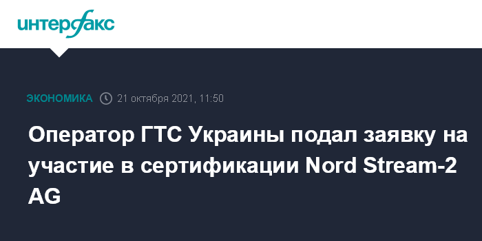Москва. 21 октября. INTERFAX.RU - ООО "Оператор ГТС Украины" подал заявку германскому энергетическому регулятору Bundesnetzagentur (Федеральное сетевое агентство Германии, BNetzA) на участие в процессе сертификации оператора "Северного потока-2" Nord Stream-2 AG.