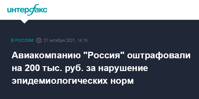 Москва. 21 октября. INTERFAX.RU - Московский районный суд Петербурга привлек к административной ответственности АО "Авиакомпания "Россия" за нарушение санитарно-эпидемиологического законодательства, сообщает в четверг объединенная пресс-служба судов города.