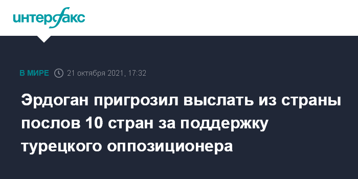 Москва. 21 октября. INTERFAX.RU - Президент Турции Реджеп Тайип Эрдоган заявил в четверг, что выдворит из страны послов десяти западных стран, которые ранее выступили в защиту 64-летнего Османа Кавалы - родившегося в Париже турецкого филантропа и активиста, находящегося с 2017 года в заключении в Турции без вынесенного приговора, сообщает в четверг французский телеканал France 24.