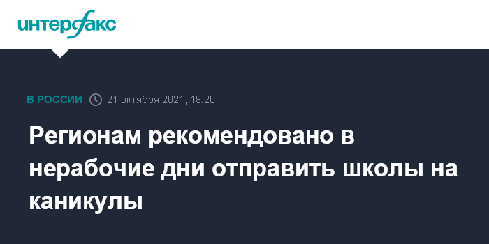"Министерство просвещения направило региональным органам управления образованием рекомендации организовать в школах каникулы в даты, обозначенные указом президента как нерабочие дни: с 30 октября по 7 ноября", - говорится в сообщении пресс-службы в четверг.