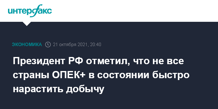 "Даже сегодня страны ОПЕК+ наращивают объемы добычи даже чуть больше, чем договорились это делать. Но это могут сделать не все, далеко не все нефтедобывающие страны в состоянии быстро нарастить добычу. Это процесс долгосрочный, цикл (инвестирования - ИФ) большой", - сказал президент РФ.