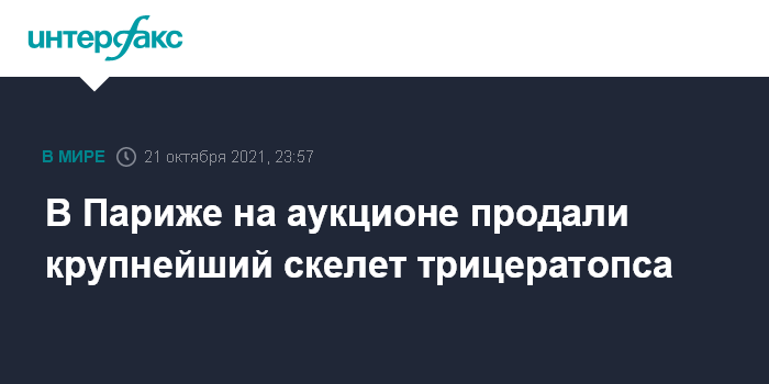Москва. 21 октября. INTERFAX.RU - Окаменелые останки крупнейшего (из найденных) динозавра-трицератопса Большого Джона были проданы на аукционе во французской столице, сообщает BBC News.