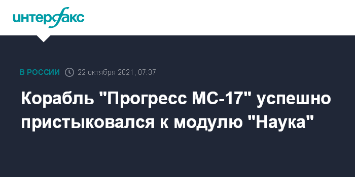 Москва. 22 октября. INTERFAX.RU - Грузовой корабль "Прогресс МС-17", отстыковавшийся в четверг от модуля "Поиск", смог успешно пристыковаться к модулю "Наука", следует из трансляции "Роскосмоса".