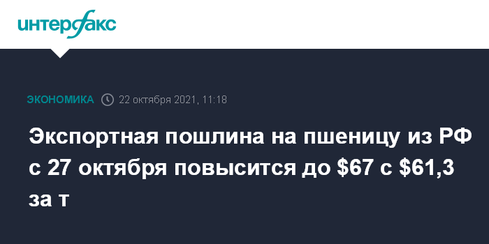 Москва. 22 октября. INTERFAX.RU - Экспортная пошлина на пшеницу из РФ с 27 октября вырастет до $67 с $61,3 за тонну (эта ставка действует с 20 октября), сообщил Минсельхоз. Пошлина на ячмень снизится до $42,6 с $45,9 за тонну, на кукурузу - повысится до $49,7 c $48,4 за тонну.