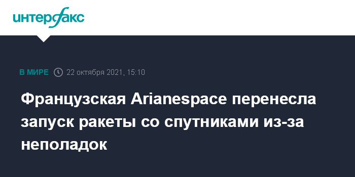 Москва. 22 октября. INTERFAX.RU - Французская аэрокосмическая компания Arianespace переносит запуск ракеты-носителя Ariane-5 с двумя спутниками из-за технических неполадок, сообщается в твиттере компании.