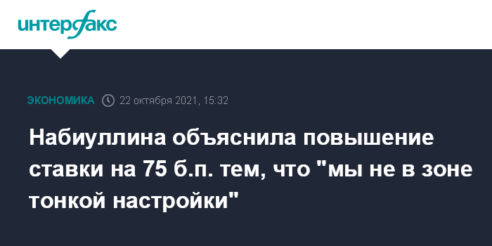 Набиуллина объяснила повышение ставки на 75 б.п. тем, что "мы не в зоне тонкой настройки"
