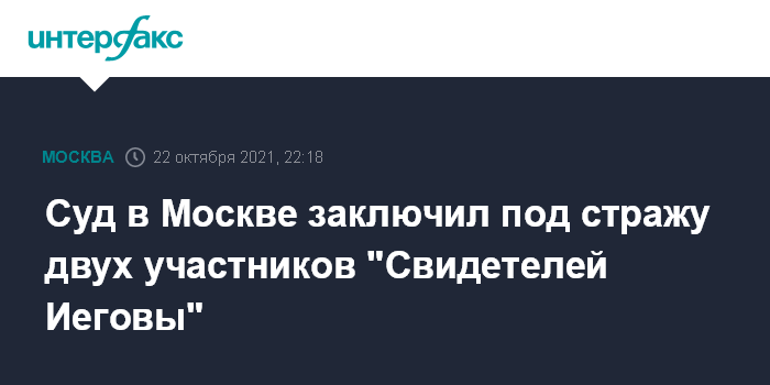 Москва. 22 октября. INTERFAX.RU - Савеловский суд Москвы в пятницу санкционировал арест двоих участников религиозной ячейки "Свидетели Иеговы", деятельность которой признана в РФ экстремистской и запрещена, еще один обвиняемый был отправлен под домашний арест.